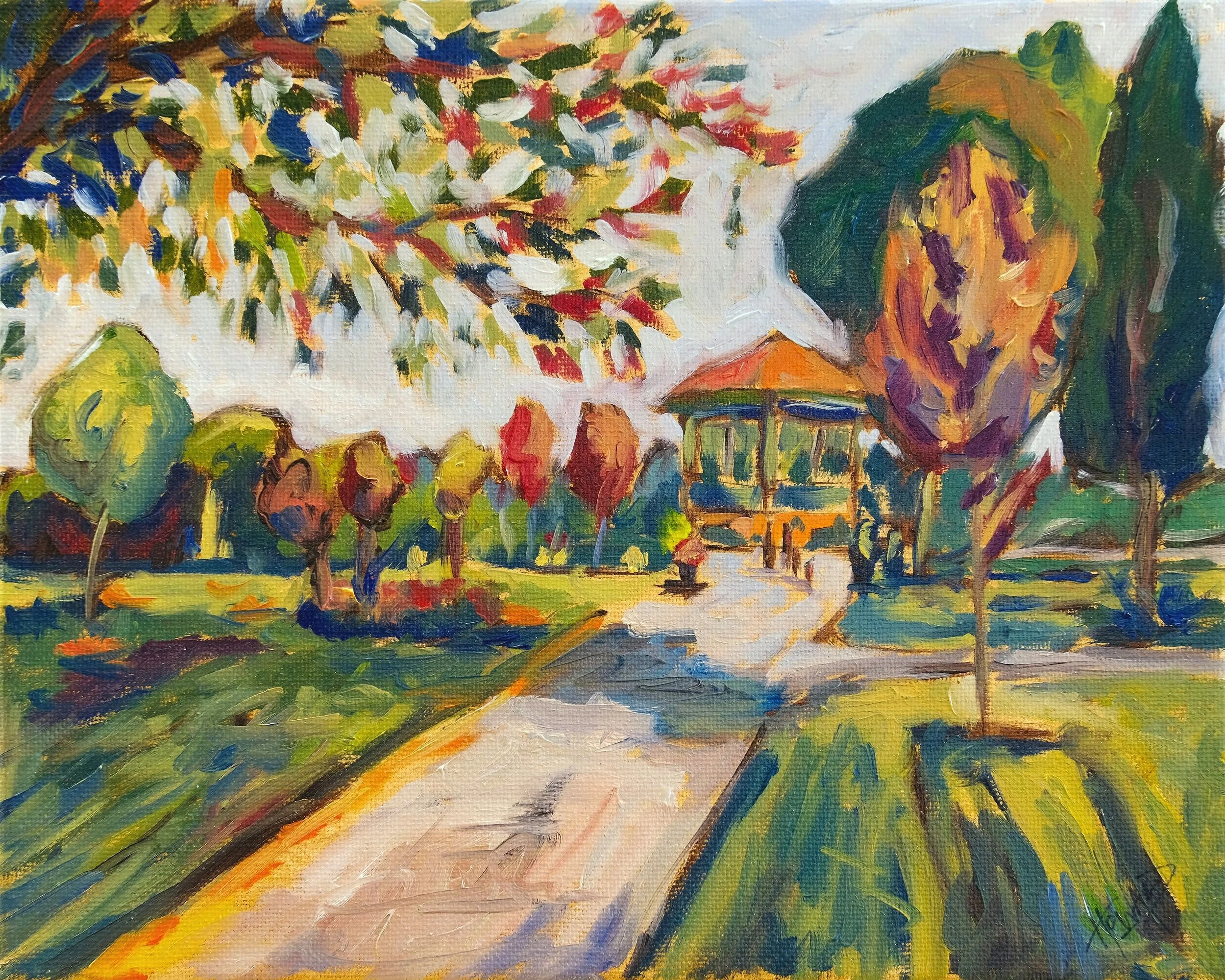 In between sorting, sobbing, and sipping cups of tea, I sketched. A lot. I had “down time”—which is just another way of saying I had too much time to think. When I came back to the States, I had a sketchbook full of scenes, even though I wasn’t exactly itching to paint. Still, I did. One of those paintings was my last happy memory with my mum—us walking around West Park in Goole with my wife and kids.
